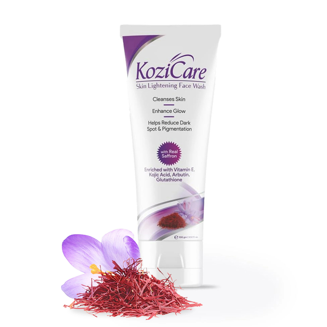 Achieve a visibly brighter, more radiant complexion with KoziCare Skin Lightening Face Wash. This gentle yet effective cleanser is specially formulated with real Saffron extract and a powerful blend of brightening agents like Kojic Acid, Alpha Arbutin, Glutathione, and Vitamin E to target dark spots, pigmentation, and uneven skin tone while deeply cleansing your skin.